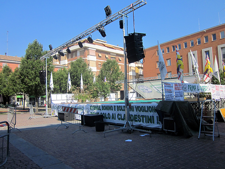Molte le proposte sventolate sui teli del palco, ma alla fine se la prenderanno con la ministra Cécile Kyenge, come già anticipa lo striscione centrale.